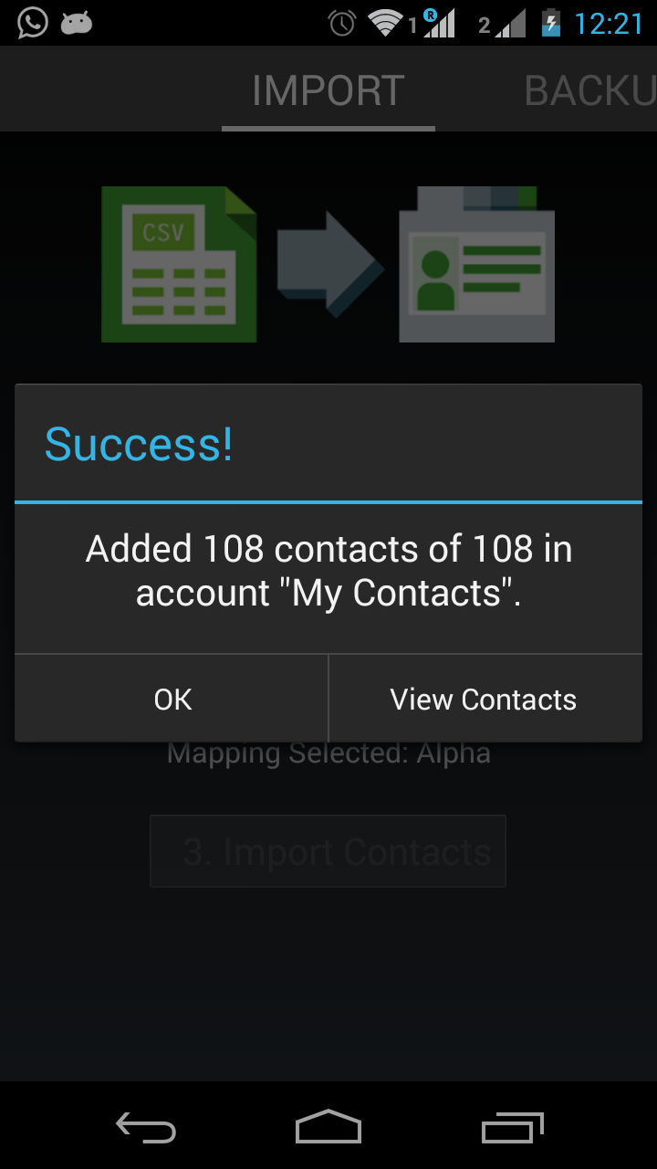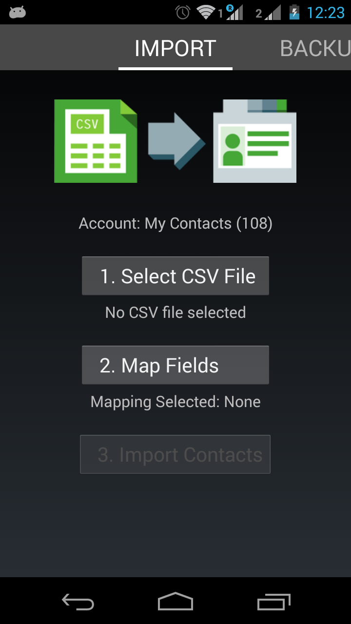 Note this is a one way import from your authorative CSV file. Contacts are imported onto a new account "My Contacts"|owned by the app. If you uninstall the app this account and contacts contained within it will be deleted. The idea is you leave the app on the phone, it does not run or use any resources when not being used. And use the app again to reimport the CSV when it changes. It is also recommended that you take backups and exports, and save outide the app.