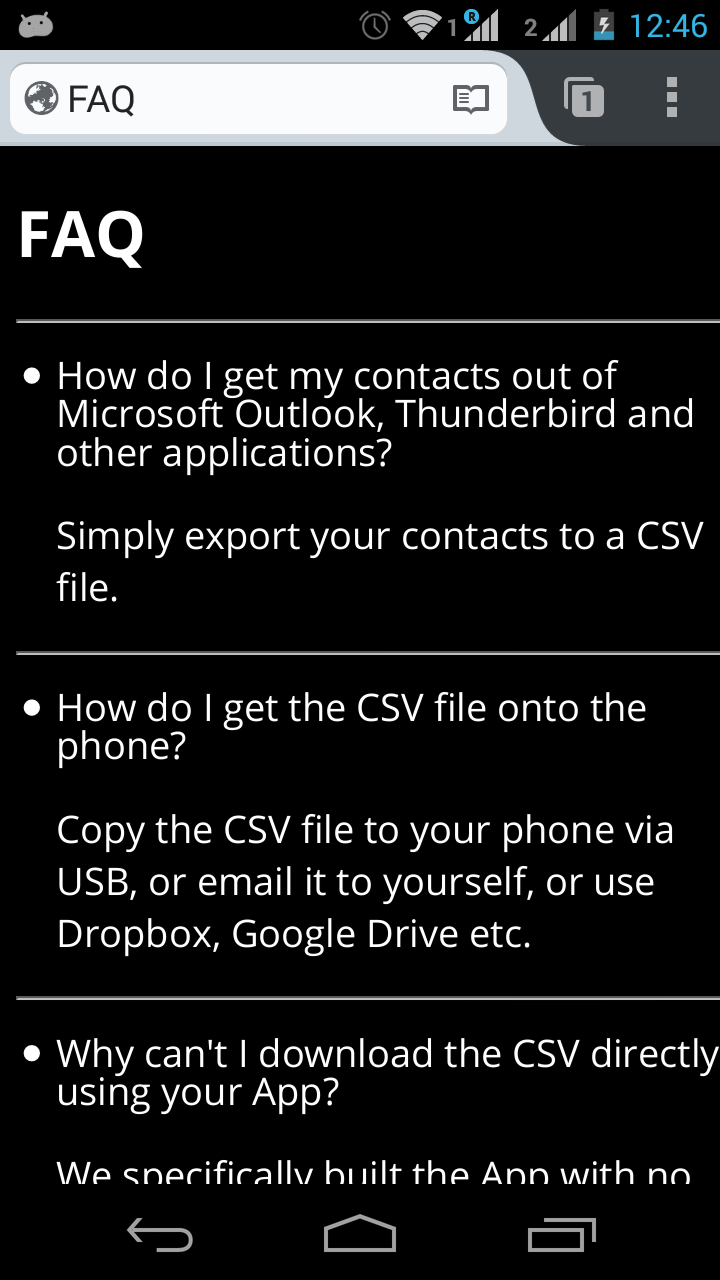 Import your CSV contacts from your favourite desktop client without any evil cloud syncing. Multi-language fully supported including all common localised codepages (from US & Westen Europe to Eastern Europe to China and Japan) and also UTF, so you get your contact information exactly how it should be on the phone.