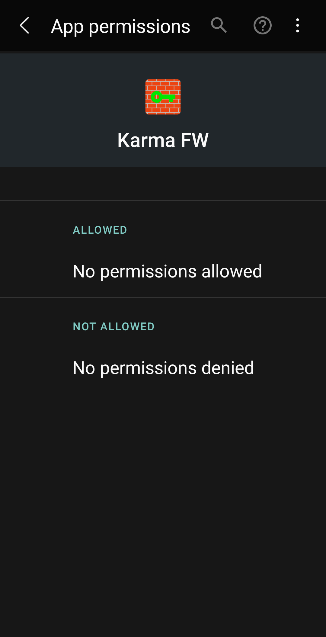 Karma FW app requires no internet permissions! No data or information about you or your phone will ever be sent back to servers in China, Russia or the USA. In fact the app only requires the start on boot permission. This is fully configurable. If you tell the app not to start on boot, it will not start on boot. No other firewall on the market requires so few permissions.