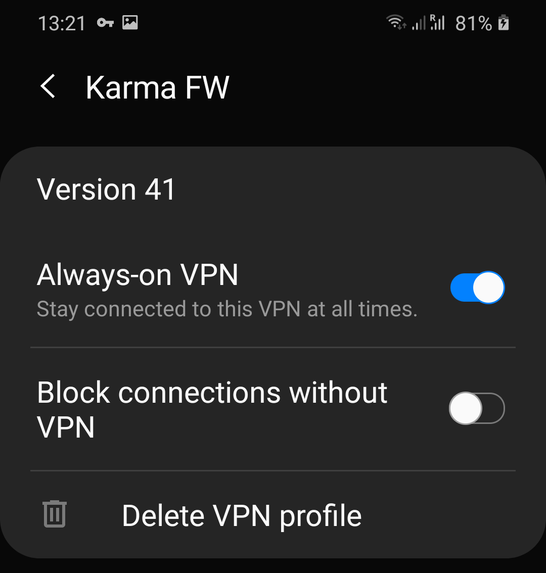 A recent study found some VPN Firewalls can be dangerous, including popular ones. This is because they have the potential to inspect your app traffic. Karma FW is completely different from all other VPN Firewalls. Karma FW requires NO Internet permissions. Without permissions CANNOT send any data anywhere. We intercept no allowed traffic. The ONLY permission Karma FW requires is start on boot!